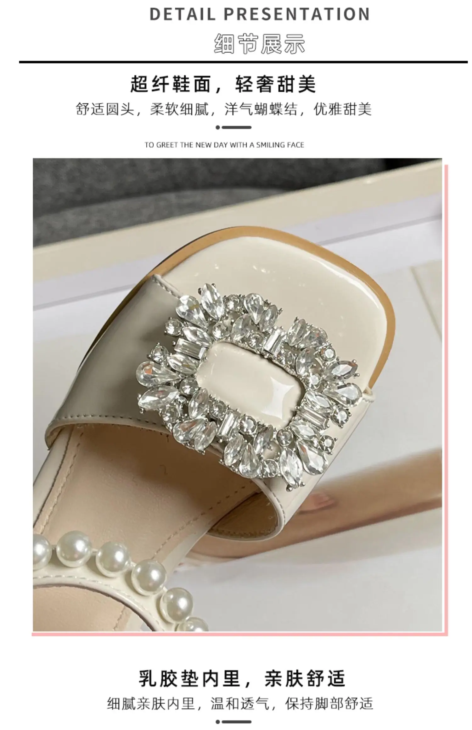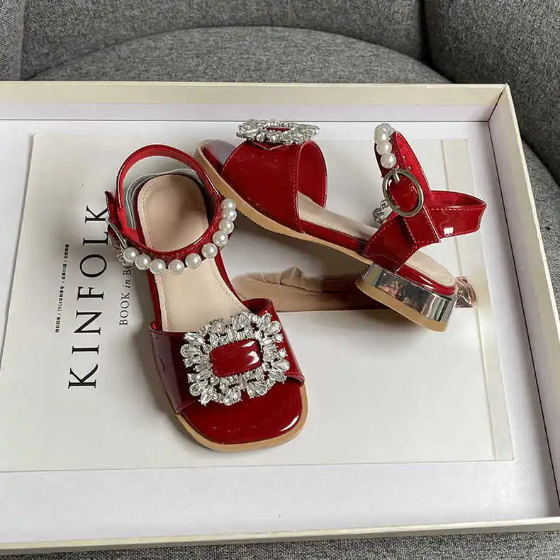 Girl's Sandals Crystal Beading Elegant Patent Leather Children Sliders Open Toe Low Heel Solid Color 26-36 Kids Summer Shoes