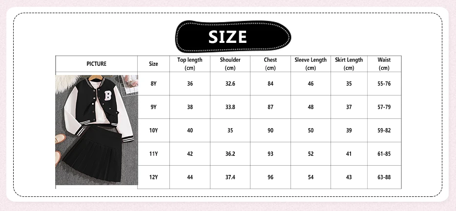 Size:12Y/Top Length:44/Shoulder:37.4/Chest:96/Sleeve Length:54/Skirt Waist:63-88/Skirt Length:43