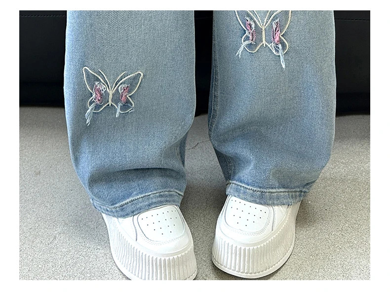 Girls versatile butterfly ripped jeans wide-leg pants 2025 new product fashionable versatile medium and large children slimming