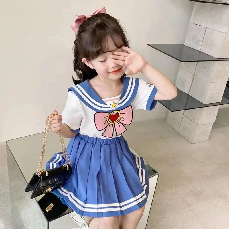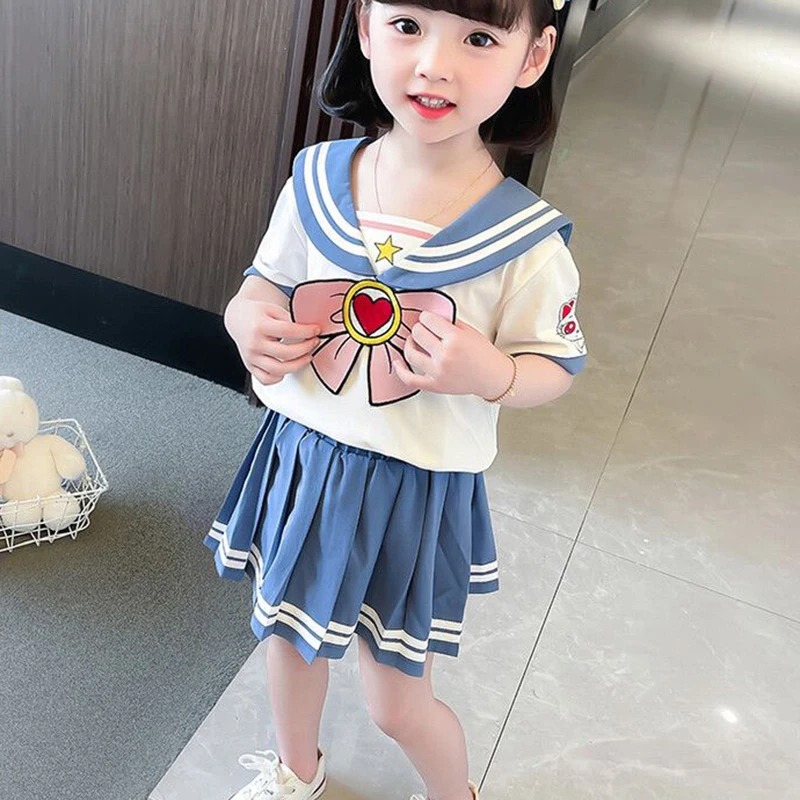 Kids Girls Clothes Sets Cartoon Bow T-Shirts Tops Pleated Skirts Suits Sailor Moon Cosplay Party Custume Children Clothes Sets